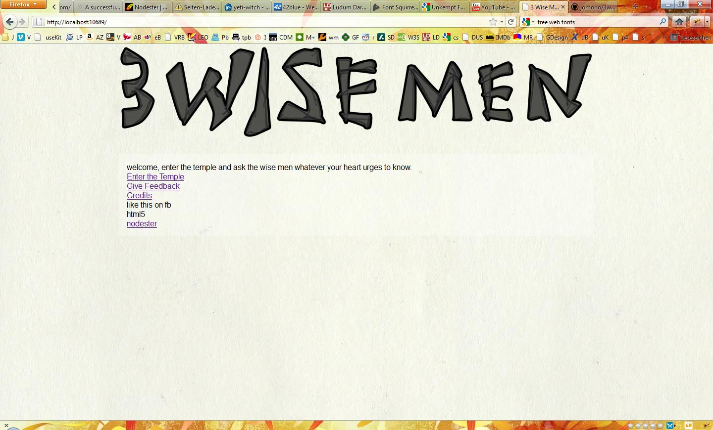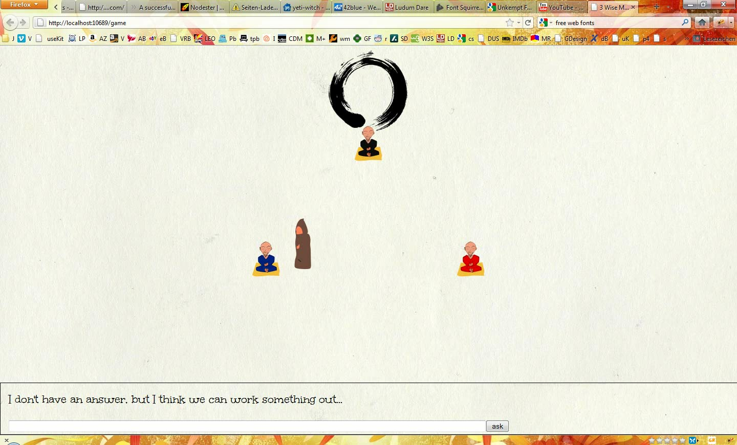 The Idea of the game is that you go into a temple, where 3 monks sit and answer your questions I wanted them to give you hints as what to ask, so you take the place of one of them, and start answering questions that other users posted.
