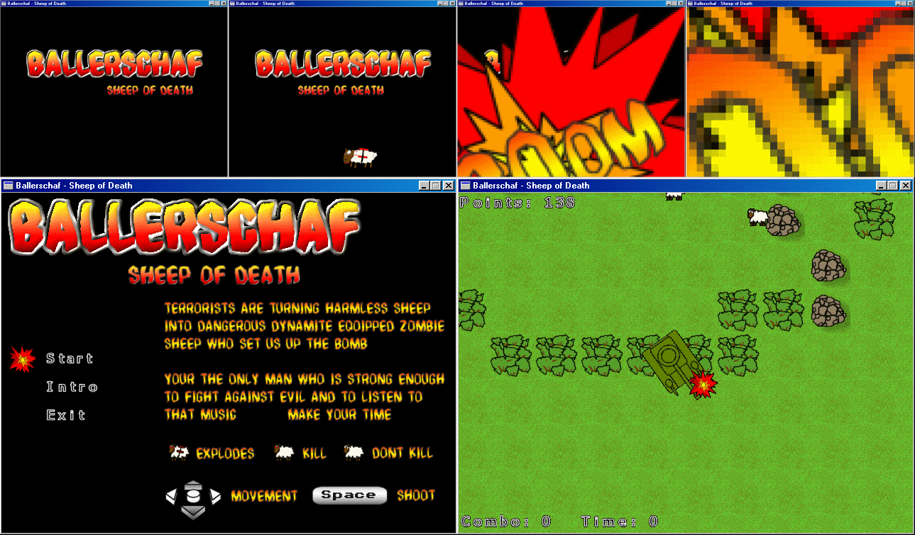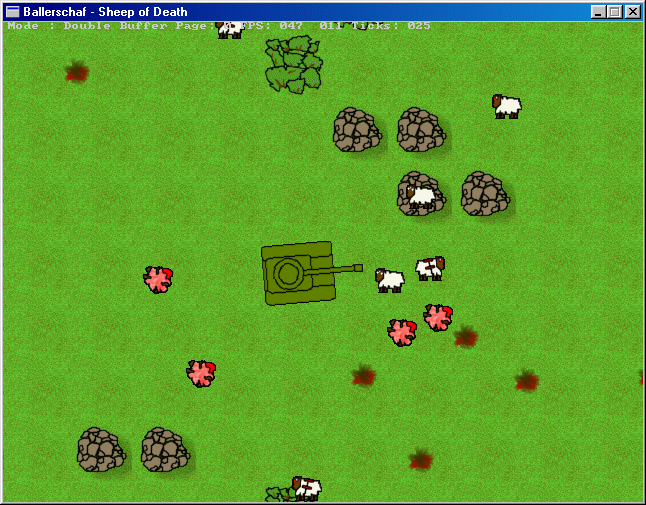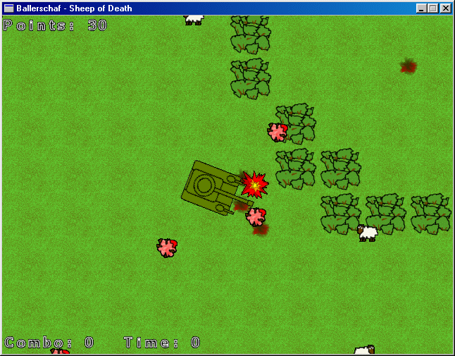 I wrote this game for the 2nd Ludumdare Game Jam. It features dynamite equiped zombie sheep that you have to destroy. You can run them over sheep with your tank or shoot them with mg and rockets. Running over healthy sheep results in point penalties. It was received as entertaining, although quite monotonous.