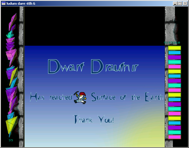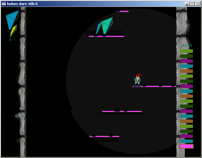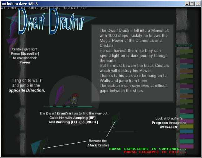 I made this game for the 6th Ludumdare Competition “Light/Darkness”. You play a Dwarf that is trapped in a deep deep mineshaft and has to escape. It was inspired by Icy Tower one of my favorite games at the time. You jump from platform to platform as it is dark in the mine you need to collect crystals to create light. A pickaxe helps you to stick to walls. The shadows and the sounds of the crystals work well to create a nice underground athmosphere.