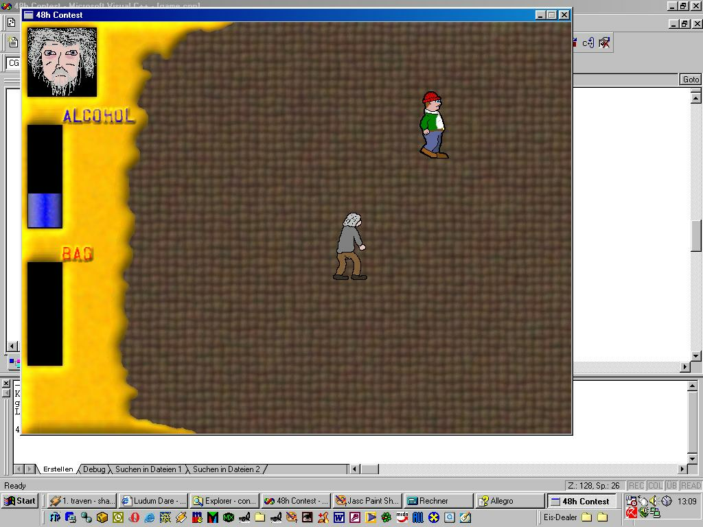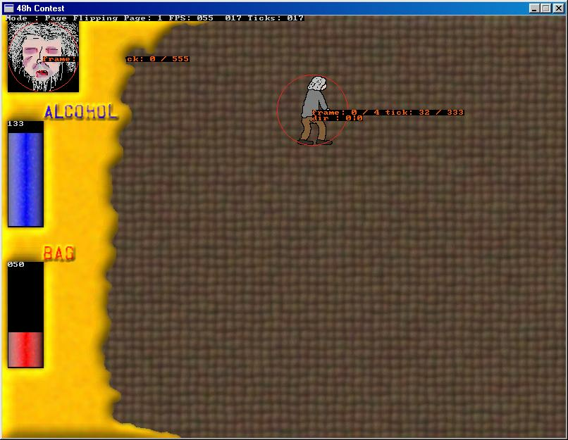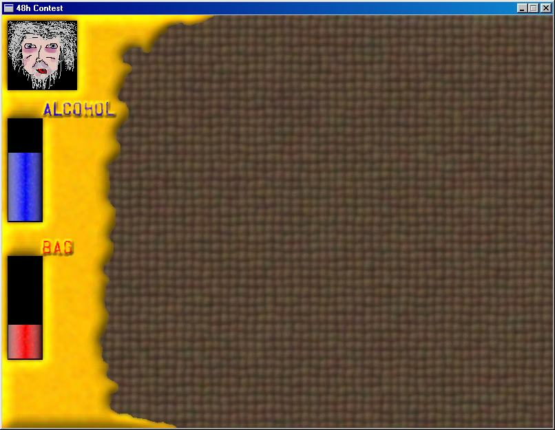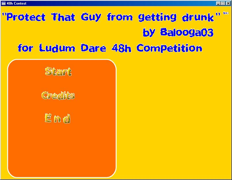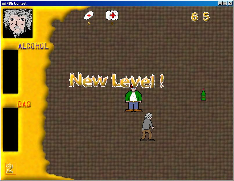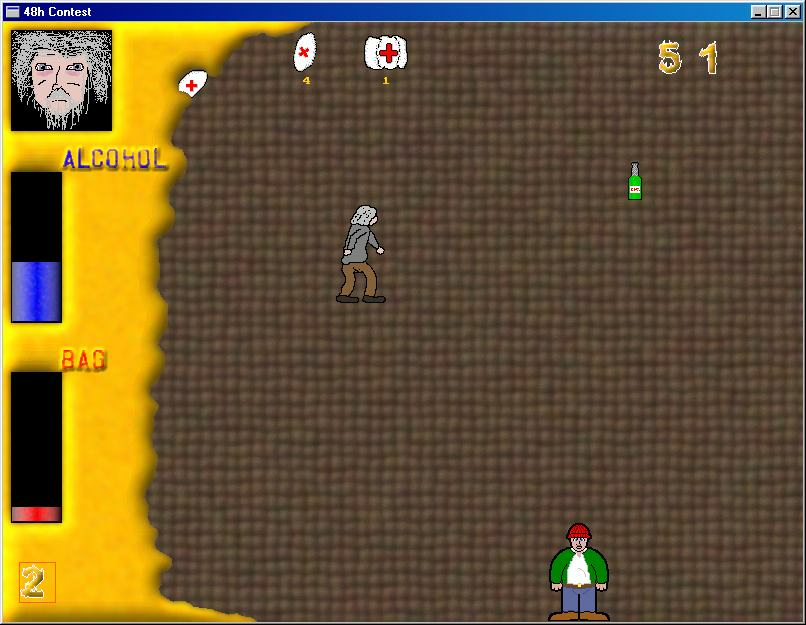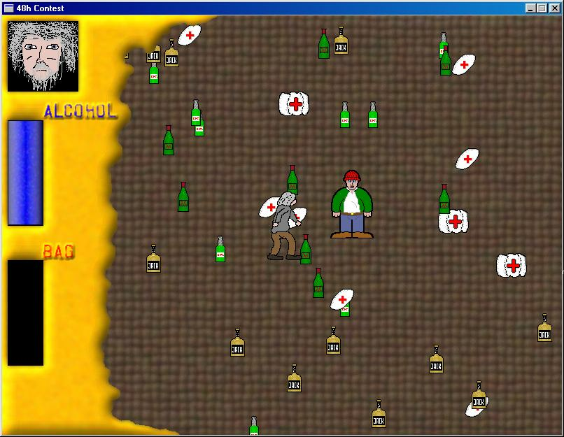 I wrote this game for the 1st Ludum Dare. You play a social worker who is supposed to protect the alcoholic bum from getting drunk. as different alcoholic beverages pop up on the scene you try to collect them before the guy reaches them. Health packages can be collected and droped on the guys route. A crude face monitor tells you about the state of our alcoholised friend.